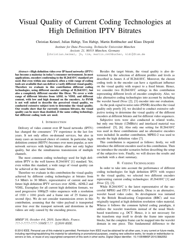 High definition video over IP based networks (IPTV) has become a mainstay in today’s consumer environment. In most applications, encoders conforming to the H.264/AVC standard are used. But even within one standard, often a wide range of coding tools are available that can deliver a vastly different visual quality. Therefore we evaluate in this contribution different coding technologies, using different encoder settings of H.264/AVC, but also a completely different encoder like Dirac. We cover a wide range of different bitrates from ADSL to VDSL and different content, with low and high demand on the encoders. As PSNR is not well suited to describe the perceived visual quality, we conducted extensive subject tests to determine the visual quality. Our results show that for currently common bitrates, the visual quality can be more than doubled, if the same coding technology, but different coding tools are used.