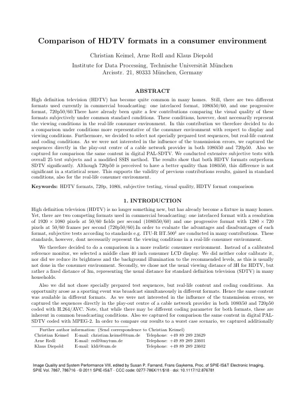 High definition television (HDTV) has become quite common in many homes. Still, there are two different formats used currently in commercial broadcasting: one interlaced format, 1080i50/60, and one progressive format, 720p50/60.There have already been quite a few contributions comparing the visual quality of these formats subjectively under common standard conditions. These conditions, however, dont necessarily represent the viewing conditions in the real-life consumer environment. In this contribution we therefore decided to do a comparison under conditions more representative of the consumer environment with respect to display and viewing conditions. Furthermore, we decided to select not specially prepared test sequences, but real-life content and coding conditions. As we were not interested in the influence of the transmission errors, we captured the sequences directly in the play-out centre of a cable network provider in both 1080i50 and 720p50. Also we captured for comparison the same content in digital PAL-SDTV. We conducted extensive subjective tests with overall 25 test subjects and a modified SSIS method. The results show that both HDTV formats outperform SDTV significantly. Although 720p50 is perceived to have a better quality than 1080i50, this difference is not significant in a statistical sense. This supports the validity of previous contributions results, gained in standard conditions, also for the real-life consumer environment.
